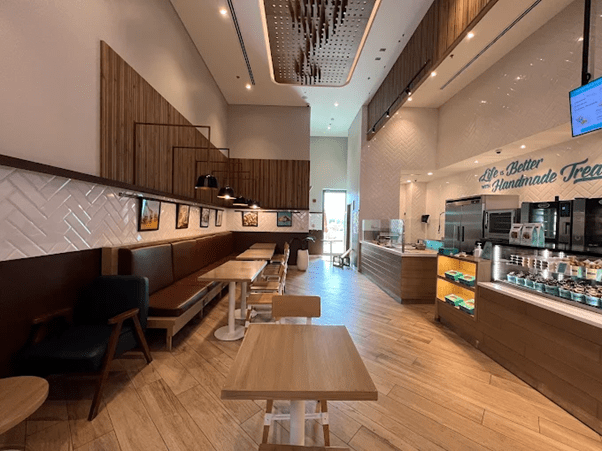 يتميّز الفرع بتصميم داخلي دافئ يعكس الهوية البصرية للعلامة، مع مساحات مريحة للجلوس وواجهة عرض مفتوحة تُمكّن الزبائن من مشاهدة عملية تحضير لفائف القرفة الطازجة أمام أعينهم. هذا العنصر التفاعلي يشكل جزءًا كبيرًا من جاذبية سينابون، حيث يمنح الزبائن شعورًا بالأصالة والثقة في جودة ما يتناولونه.